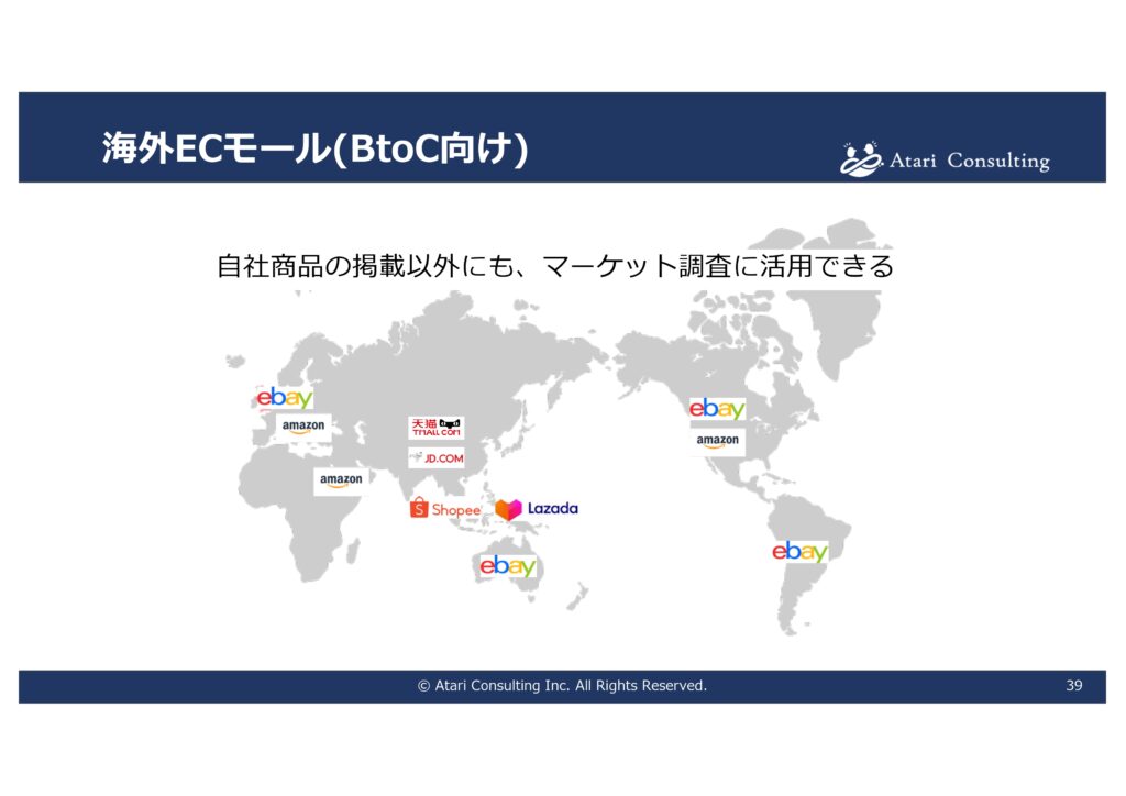 アメリカや欧州ではAmazonやeBay、中国ではTmallやJD.com、東南アジアではShopeeやLazadaなどがあります。